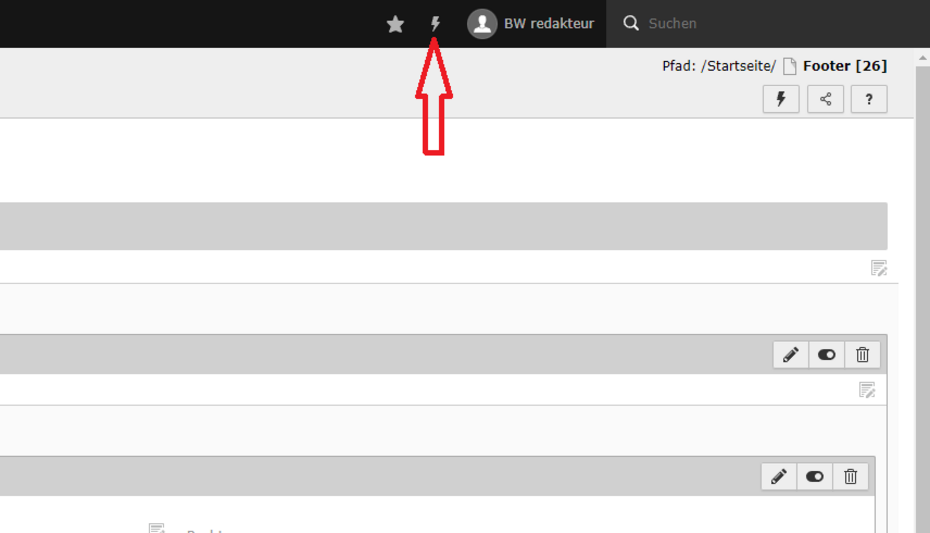 Deshalb ist es manchmal nötig den Frontend-Cache zu leeren. Dies geschieht über Klick auf den Blitz neben den Nutzeroptionen: