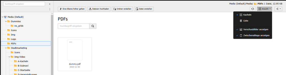 Es öffnete sich ein übergeordnetes Fenster (Pop-up-Fenster der Dateiliste), in dem alle bereits hochgeladenen Dateien zu sehen sind, oder in dem die Möglichkeit besteht, Dateien hochzuladen.